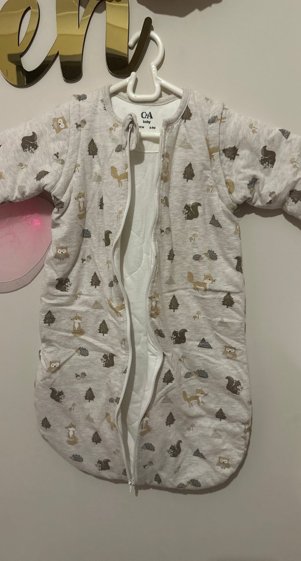 Gri renkli, orman hayvanları ve ağaç desenli bebek uyku tulumu. Yumuşak ve sıcak kumaştan, uzun kollu ve önden fermuarlı.