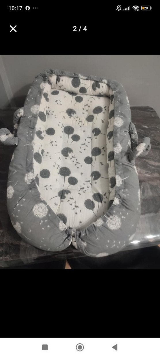 Gri renkli, maskara desenli, yumuşak sentetik kumaştan yapılmış bebek uyku yatağıdır. Rahat ve güvenli bir uyku alanı sağlar.