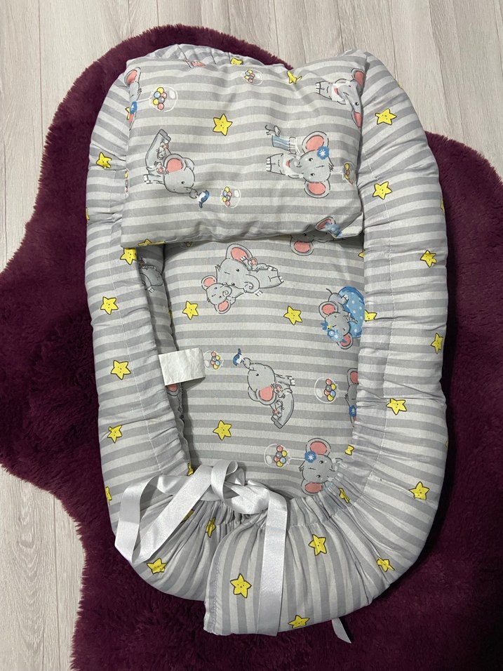 Yumuşak sentetik kumaştan yapılmış, fare ve yıldız desenli gri bebek uyku yatağı ve küçük yastık içerir. sadece 1-2 defa kullanıldı
