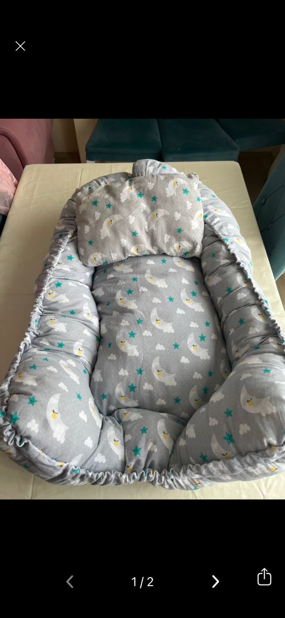Bulut, yıldız ve ay desenli gri bebek yatağı ve yastık seti. Yumuşak sentetik kumaştan yapılmıştır, rahat uyku sağlar.