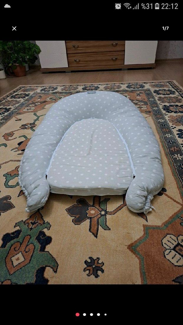 Gri benekli desene sahip, yumuşak dolgulu bebek yatak minderi, rahat uyku için tasarlanmıştır. ️