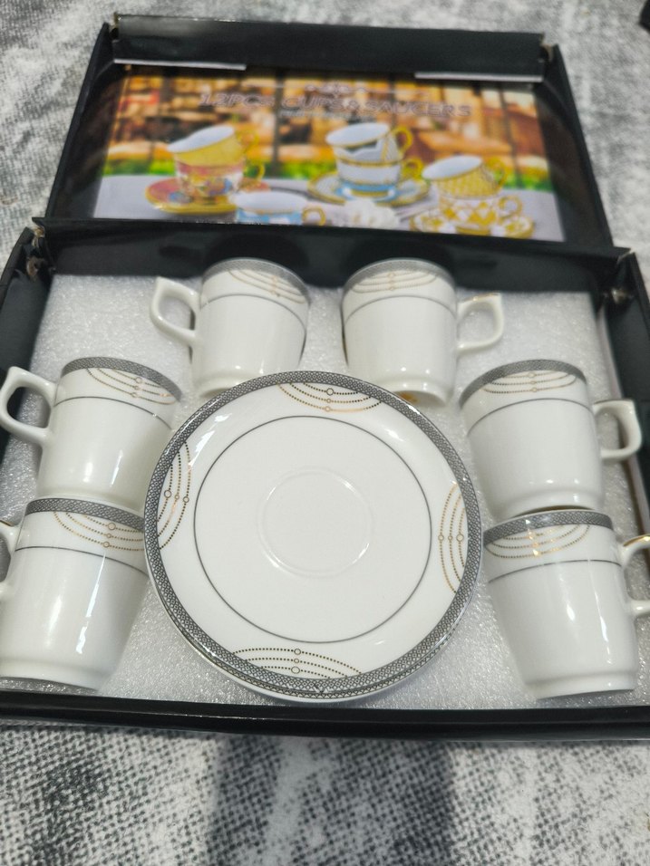Gri desenli kenarlara sahip 6 beyaz kahve fincanı ve uyumlu tabaklardan oluşan set. Şık tasarımıyla kahve keyfinize zarif bir dokunuş katıyor. ☕ resimdeki uygun kutu içinde gönderilecek