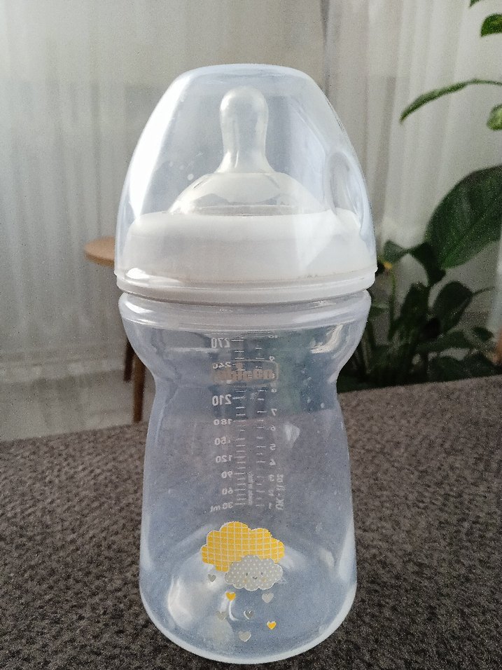 Gri bulut desenli beyaz bebek biberonu, ölçü işaretleri ve şeffaf kapaklı. Tutması kolay şekle sahip.