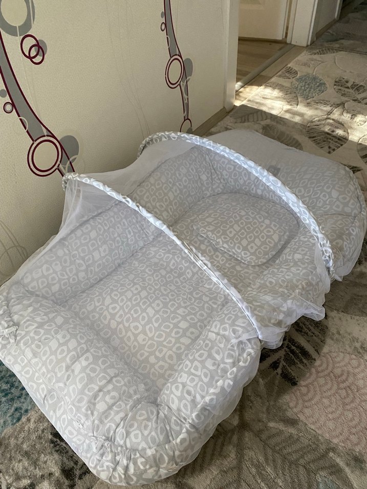 Gri desenli yumuşak kumaştan beyaz bebek yatağı ve koruyucu tül ile konforlu ve güvenli.