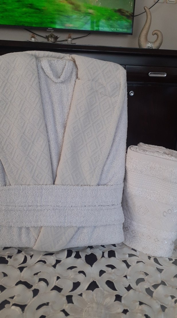 Gri desen detaylı beyaz bornoz, yumuşak ve konforlu kumaştan, klasik tasarıma sahip. Ayarlanabilir kemer bulunur. BAŞ HAVLUSU 50X90 CM birinci sınıf kaliteye sahiptir