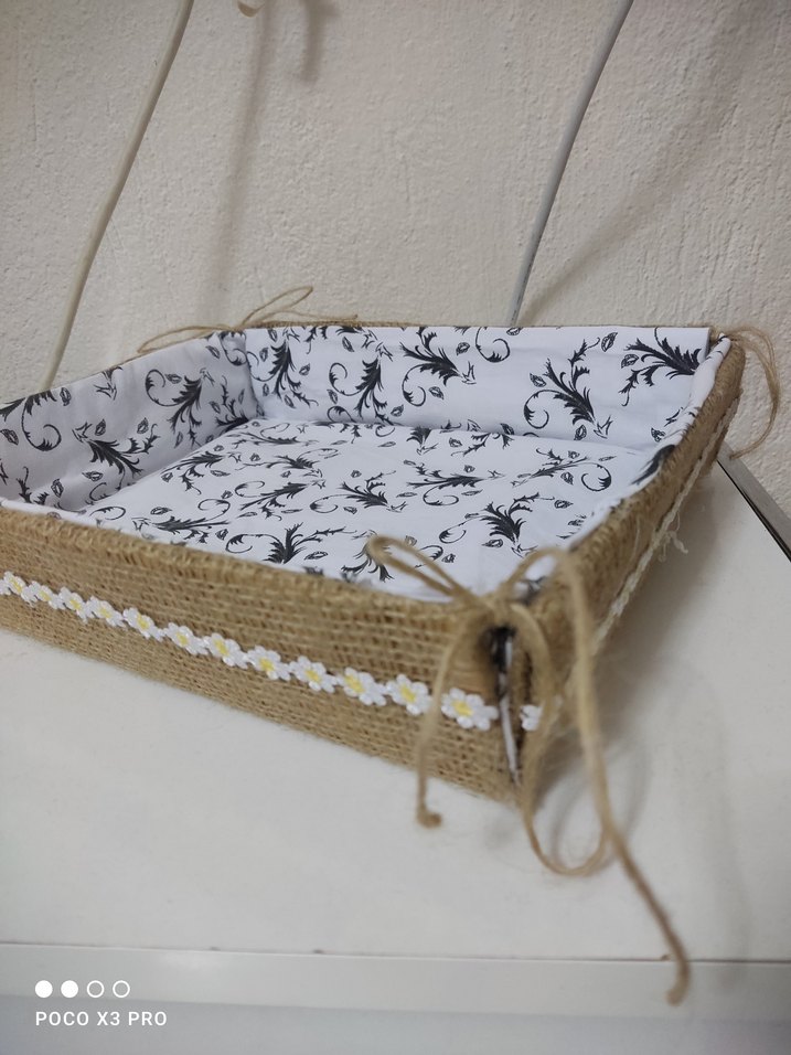 Gri çiçek desenli beyaz saklama sepeti, yanlarında rustik ip detayları ve dekoratif bağlama ipleri bulunur. ekmek sepeti