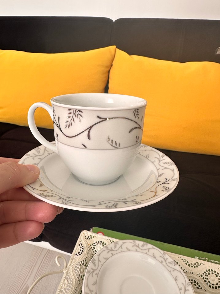 Gri yaprak desenleriyle süslenmiş beyaz fincan ve tabağı. Kulplu fincan ve uyumlu tabak seti. ☕Kütahya porselen bir tanesinin kulübü kırık ama bir iki defa kullanıldı kırık olan atıldı