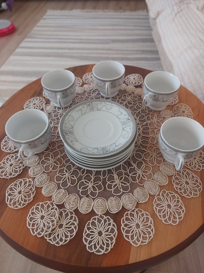 Gri desenli beyaz fincanlar ve tabaklardan oluşan içecek servisi seti. ☕5 adettir.