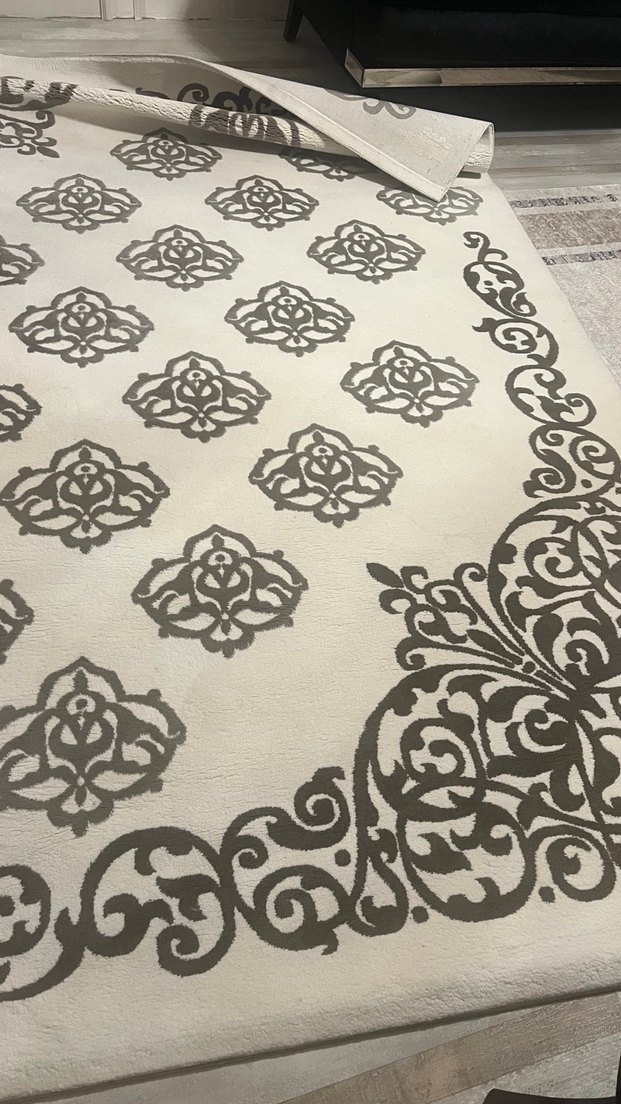 Beyaz zemin üzerine gri renkli geleneksel desenler ve süslü kenarlıkları olan halı, kullanılmıştır iyi durumda