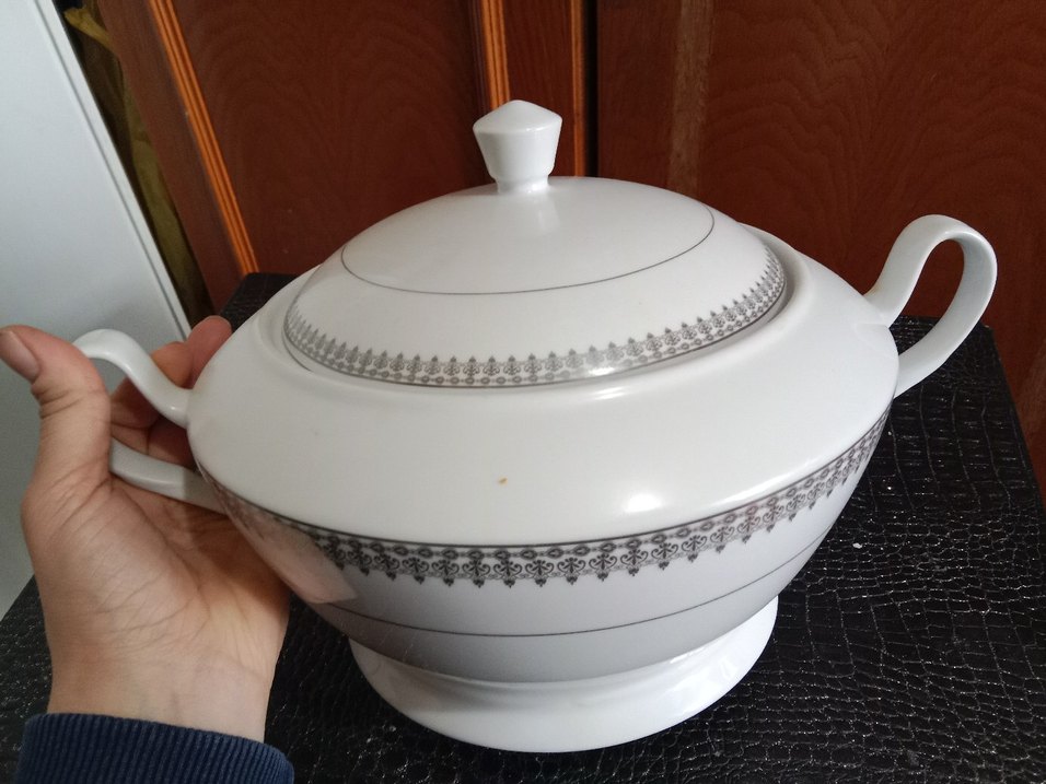 Gri desenli beyaz, kapaklı çorba kasesi, klasik tarzda.