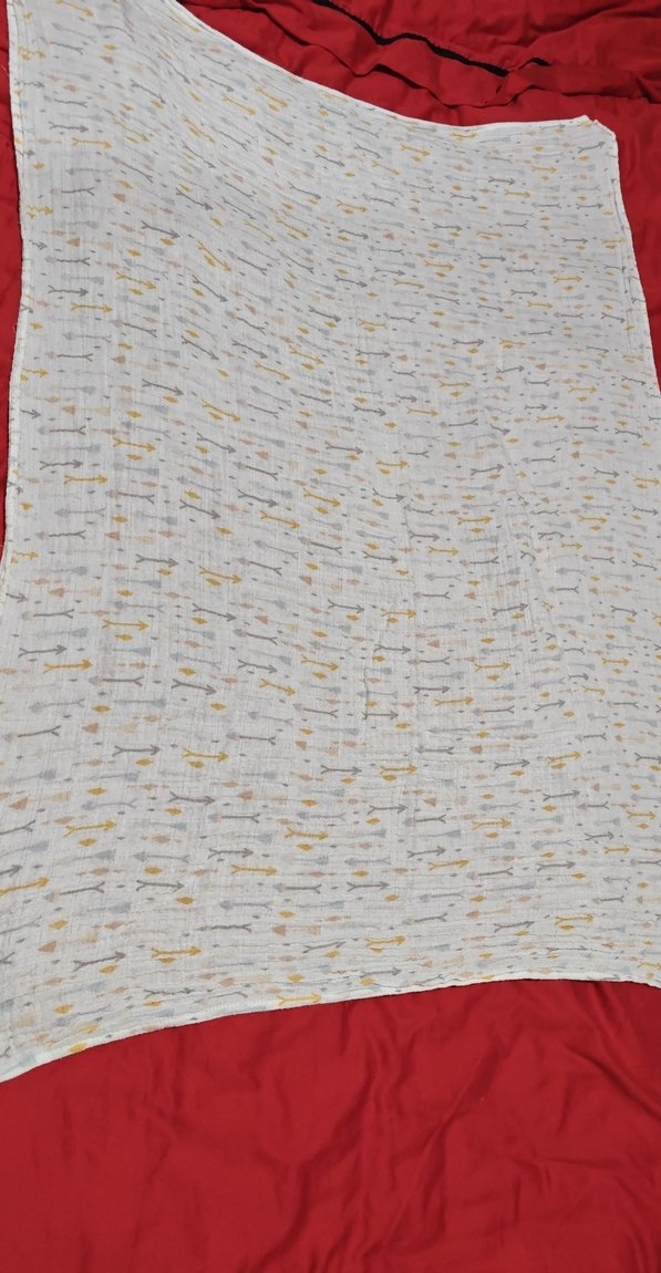 Yumuşak müslim kumaştan yapılmış, gri ve sarı ok desenleriyle beyaz bebekk battaniyesi. ️sorunsuz 105x70