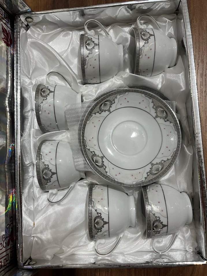 Gri desenli beyaz porselen çay fincanı takımı, altı fincan ve uyumlu tabaklardan oluşur, şık kutusunda sunulmuştur. ☕
