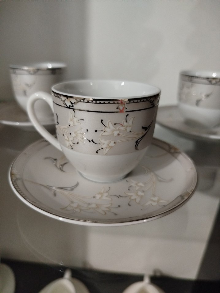 Gri çiçek desenli beyaz porselen fincan ve tabak seti. Çay veya kahve için uygun, zarif tasarım. ☕6 kişilik