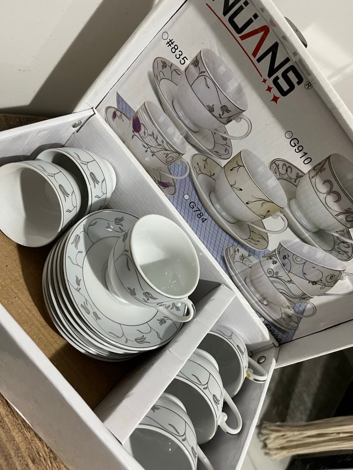 Beyaz porselen fincan takımı, gri çiçek desenleriyle birlikte gelir ve uyumlu tabakları içerir. OG910 kodlu bu set şık bir sunum sağlar. ☕ kusuru yok çok fincanım olduğu için satıyorum.