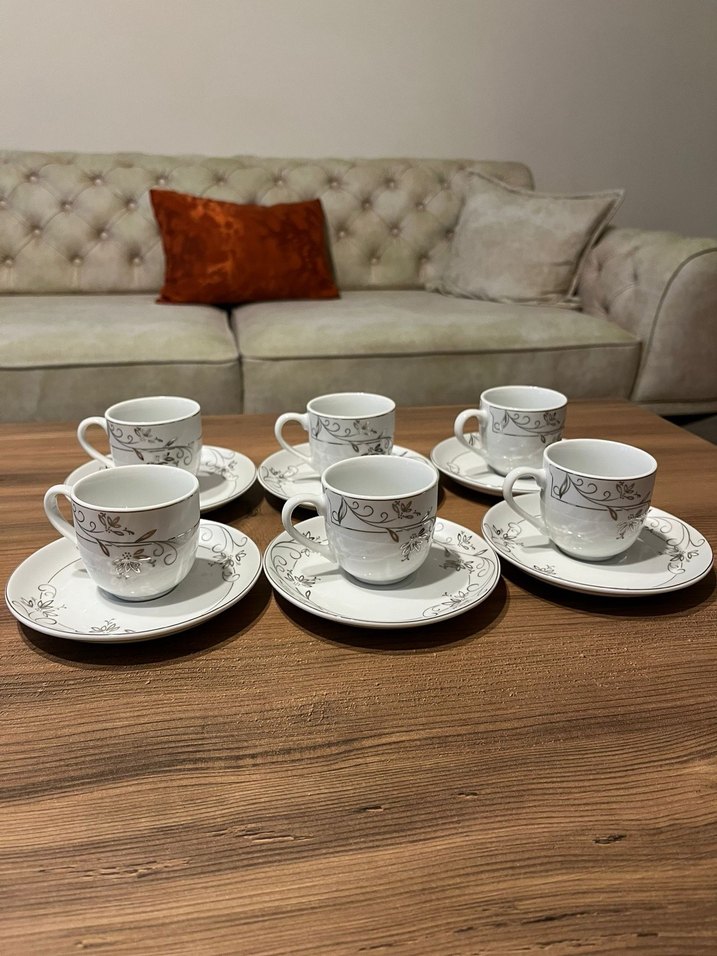 Altı adet beyaz porselen fincan ve tabaktan oluşan takım, üzerlerinde ince gri çiçek desenleri bulunur. Şık sunum için uygundur. ☕ 12 parça