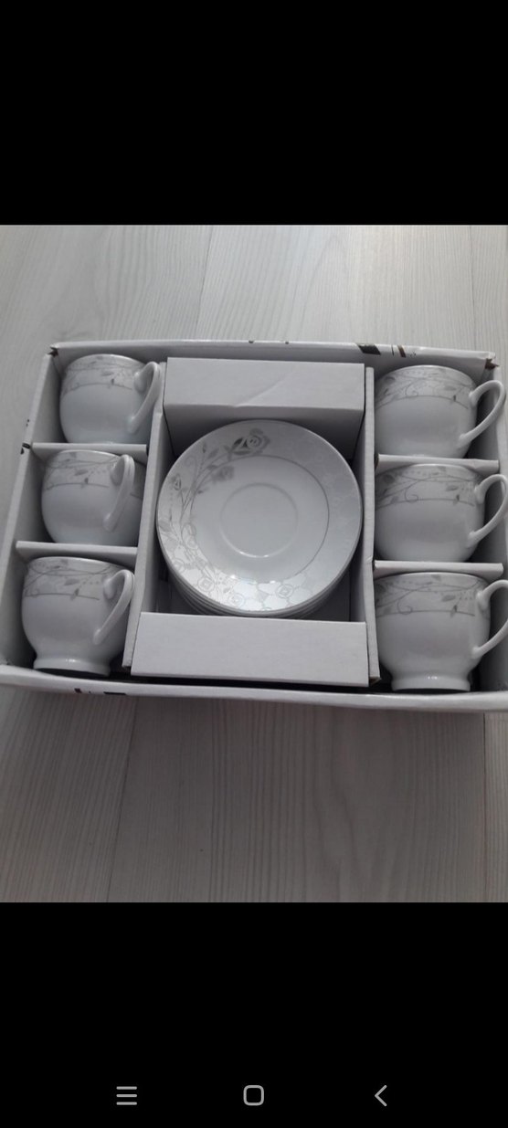 Gri çiçek desenli beyaz porselen kahve fincanları ve uyumlu tabaklardan oluşan set. ☕