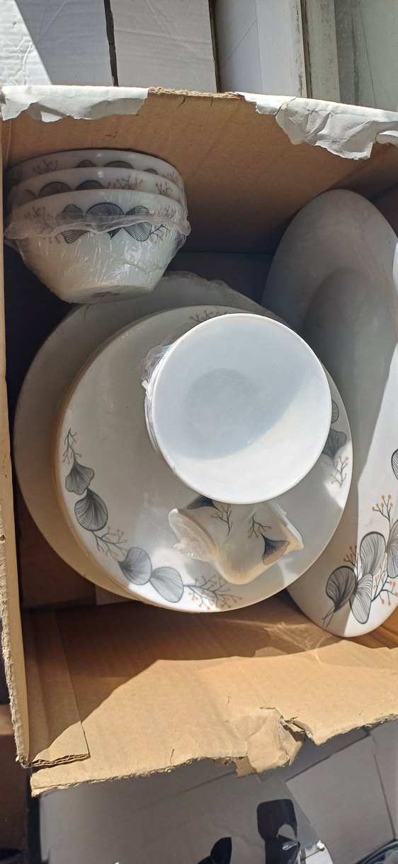 Beyaz porselenden yapılmış, gri yaprak desenli tabak seti 28 parça dan oluşuyor