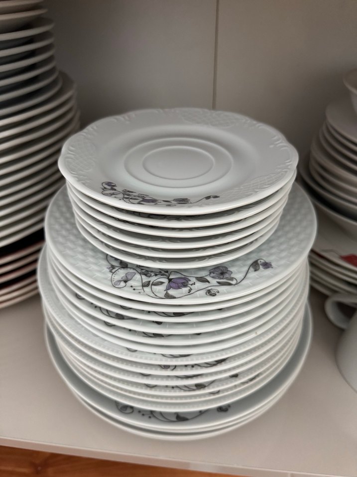 Gri çiçek desenli beyaz seramik tabaklar, düzgün şekilde üst üste dizilmiş. Tabakların yüzeyi pürüzsüz ve zarif detaylara sahip. ️