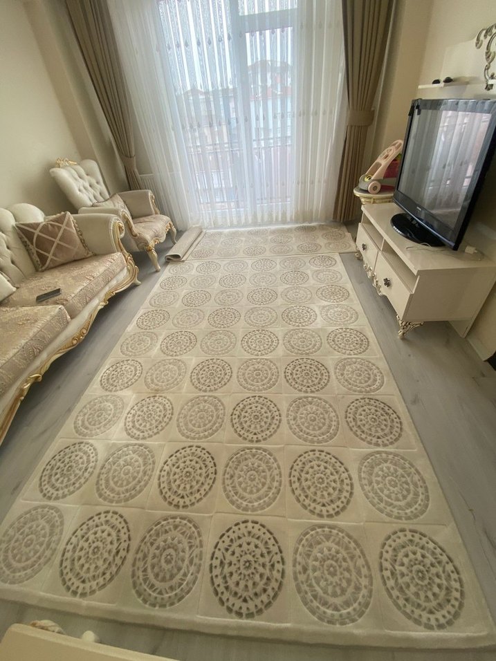 Beyaz ve gri tonlarda soyut desenli konvansiyonel halı, her odaya zarif ve sade bir dokunuş katar.
