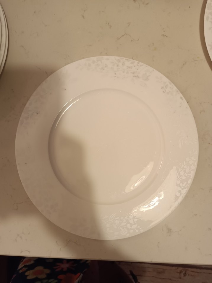 Beyaz tabak, kenarında ince gri çiçek desenleriyle, dayanıklı ve pürüzsüz malzemeden yapılmıştır. ️ 12 adet pasta tabağı, birinin kenarı kırık 12 adet çukur tabak 12 adet düz tabak 2 adet büyük kayık tabak 2 adet küçük kayık tabak. Makinada yıkandığı için yıpranma lekeleri mevcut 10 yıldır aktif kullandım. takım fiyatıdır. adet olarak almak isteyenler de mesaj atabilir.