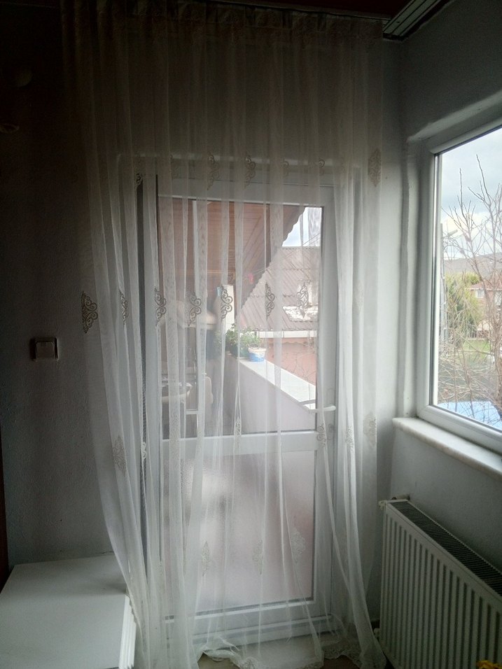 Gri desenli beyaz tül perde, pencerenize hafif ve ferah bir görünüm sağlar.