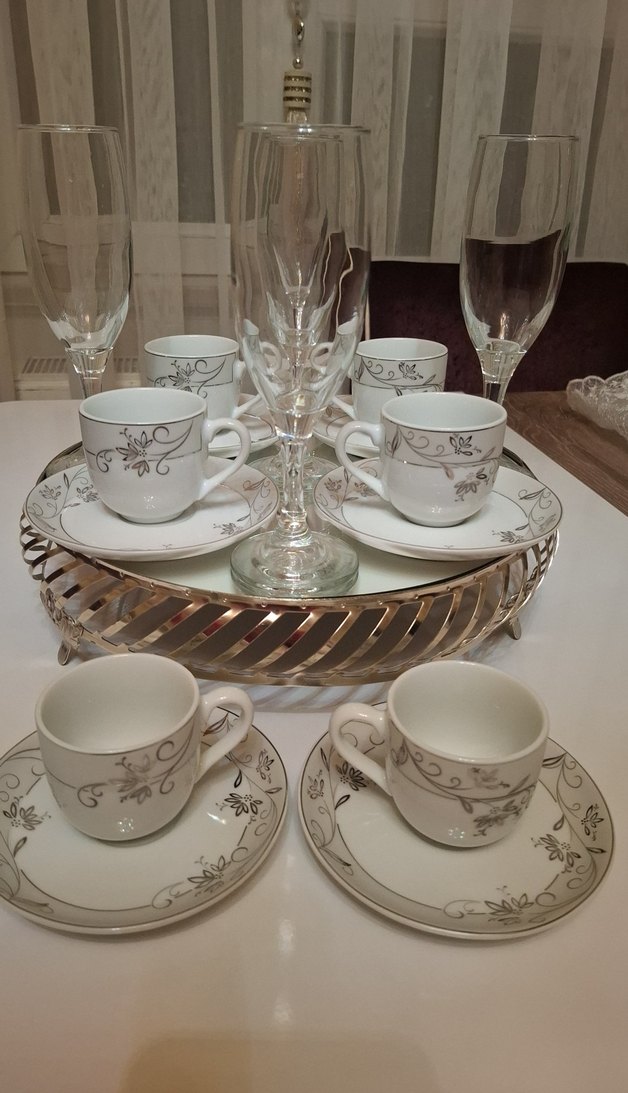 Gri çiçek desenli beyaz kahve fincanları ve tabakları, gümüş tepsi üzerinde şeffaf bardaklarla birlikte. bardaklardan bi tanesi yok 5 adet fincan takımı tam takım sıfır