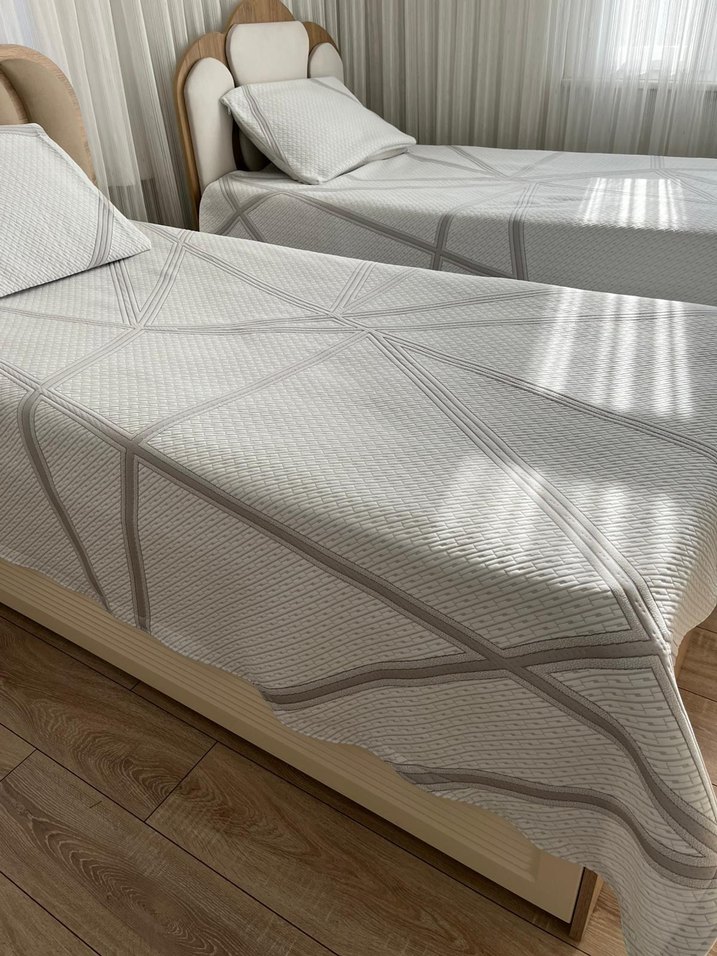 Yumuşak dokulu, gri geometrik desenli beyaz yatak örtüsü. İkiz yataklar için uygun.