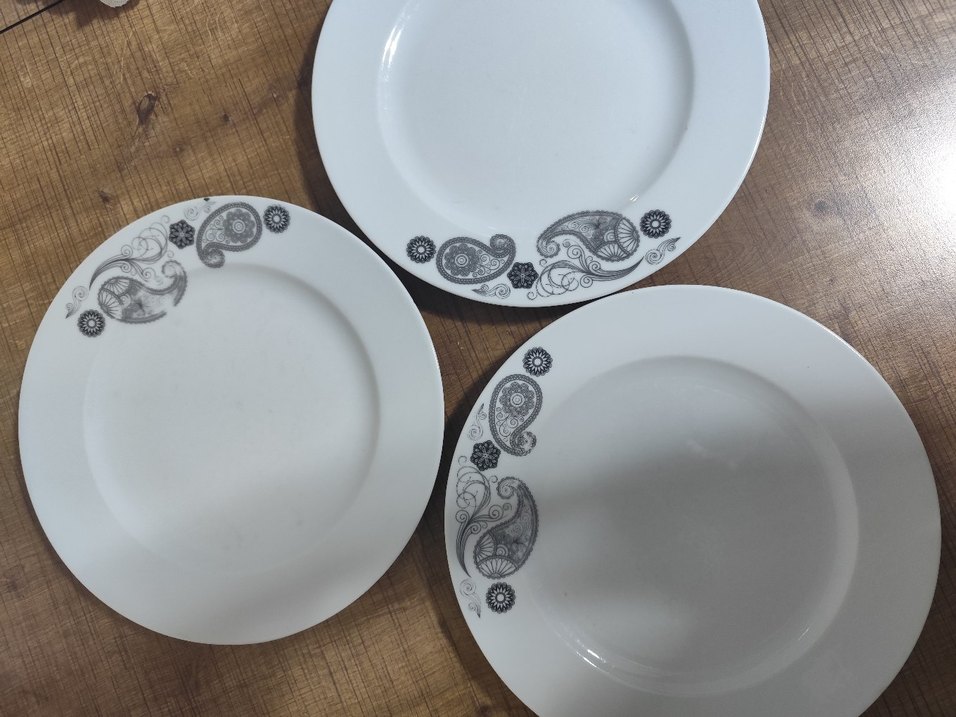 Gri detaylı çiçek ve paisley desenleriyle beyaz yemek tabakları seti. Yemek sunumları için uygundur. ️