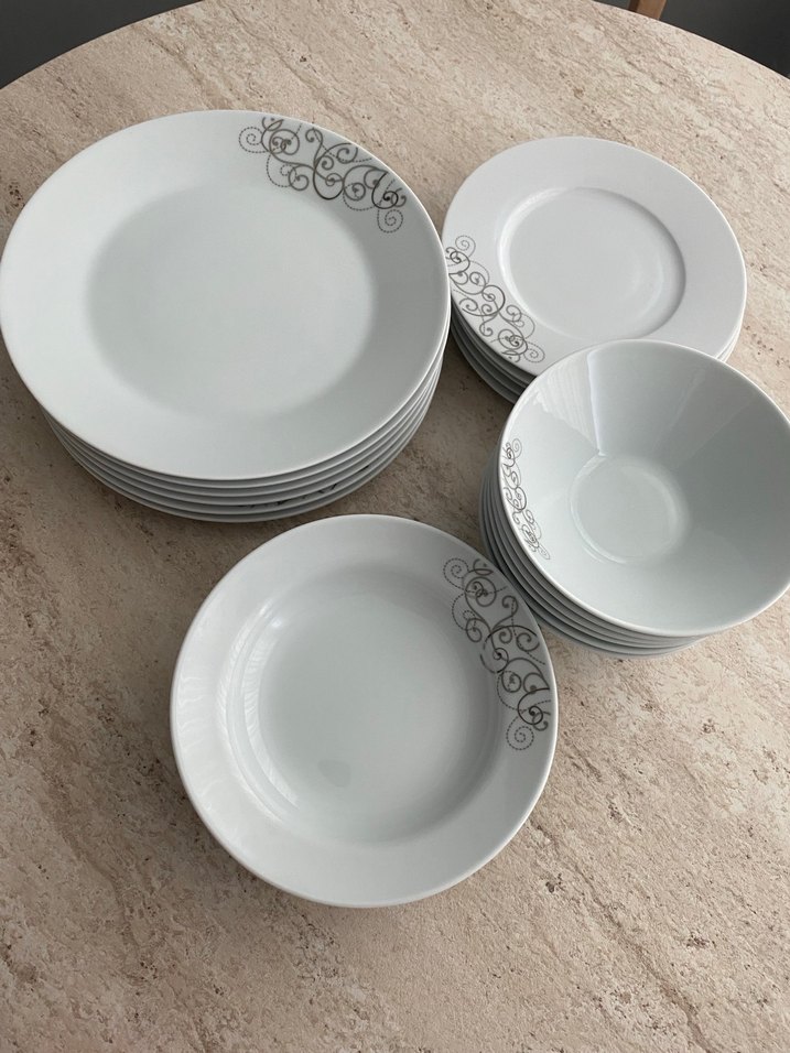 Gri desenli beyaz yemek takımı, çeşitli öğünler için tabak ve kaseler içerir. ️24 parça