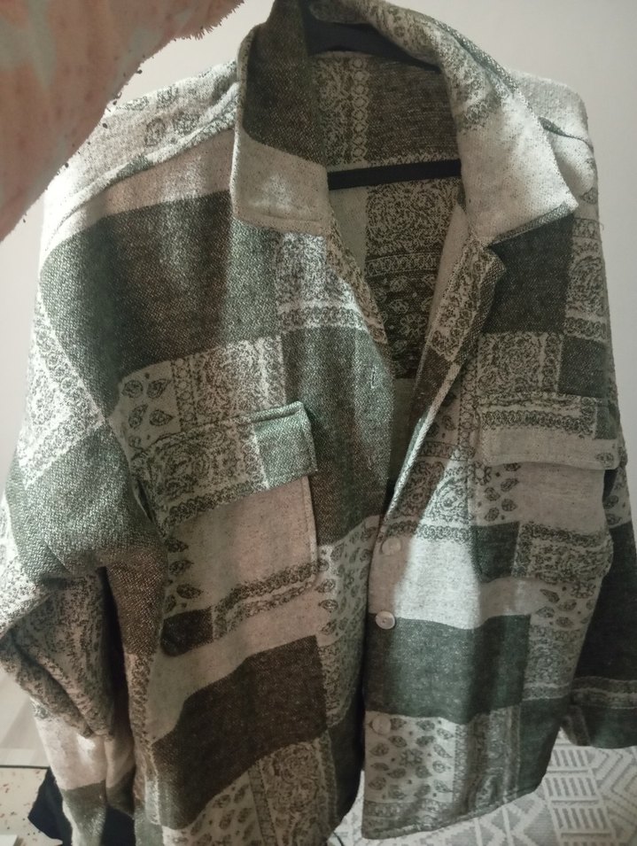 Gri desenli, düğmeli, uzun kollu, bol kesim bohem tarzı kadın gömleği, normal uzunlukta ve notlu yaka ile.