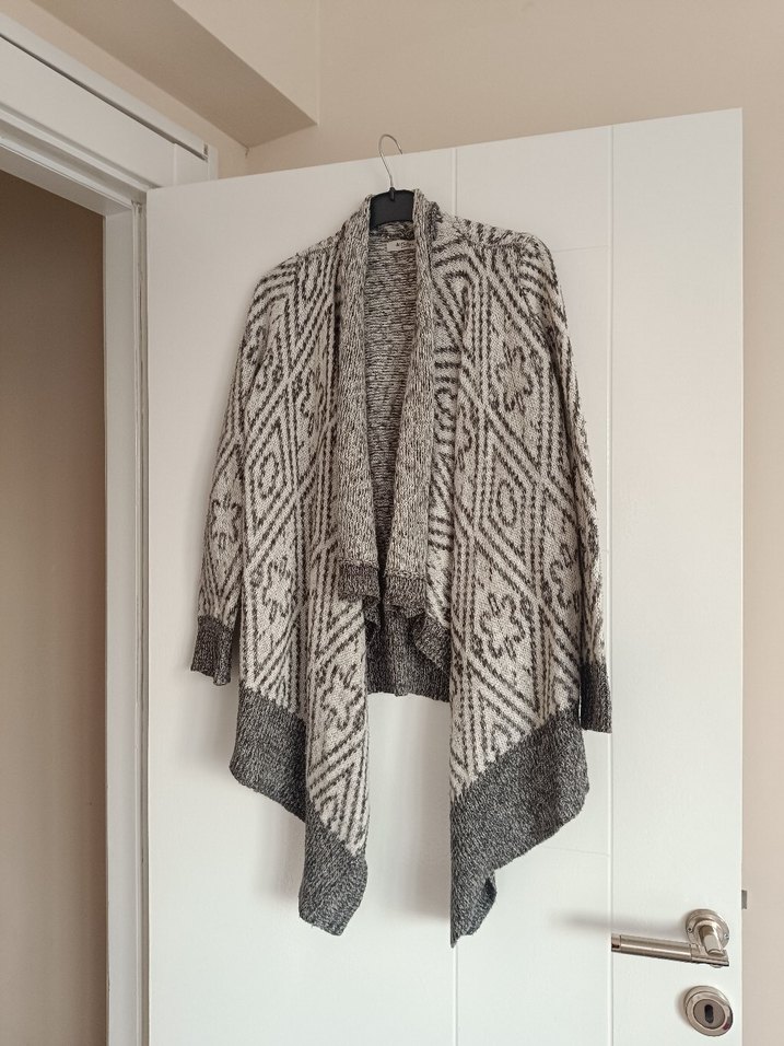 Kadınlar için örme yün kumaştan, bohem desenli gri hırka. Salaş kesim, uzun kollu ve yüksek yakalıdır. Midi boyda, rahat ve günlük kullanım için uygundur.