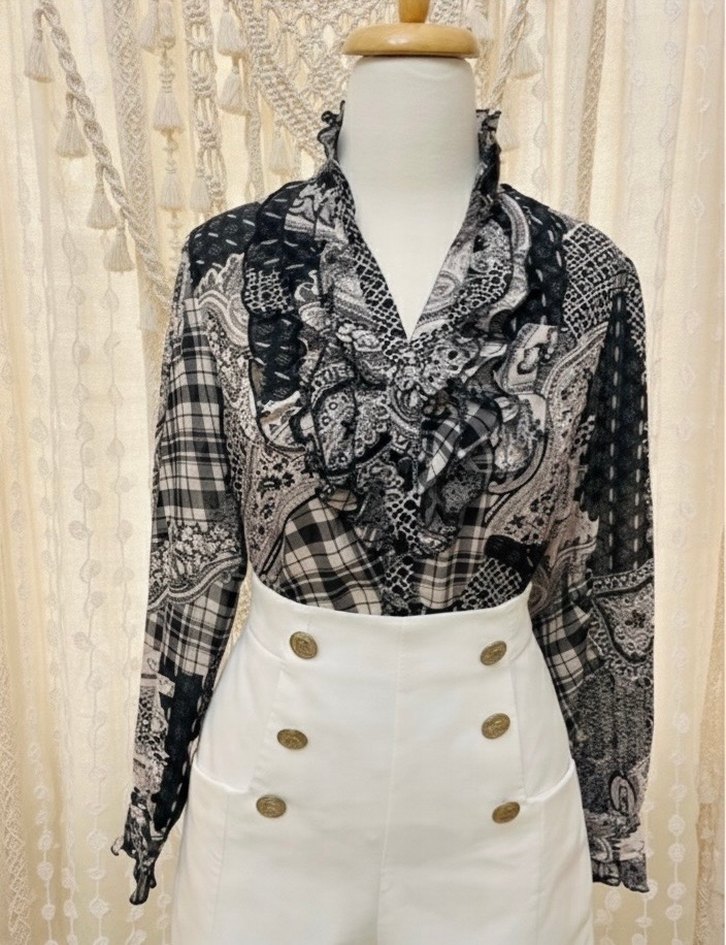 Gri desenli, uzun kollu, fırfır detaylı, bol kesim bohem / vintage kadın gömleği. Düğmeli, yumuşak kumaştan günlük kullanıma uygun. M/ L bedene uyum sağlar.