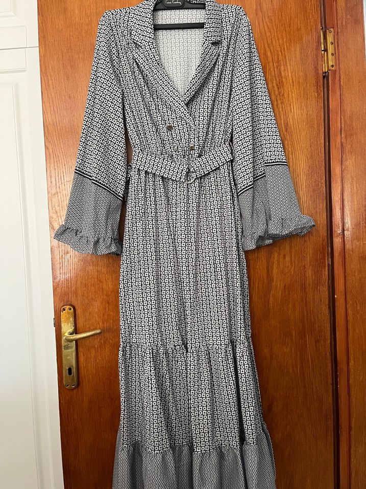 Gri desenli, bol kesim uzun elbise; pileli etek, volanlı uzun kollar ve kesik yaka detaylarına sahiptir. Bohem tarzına uygundur. Büyük geldiği için hiç giymedim herhangi bir kusuru yok
