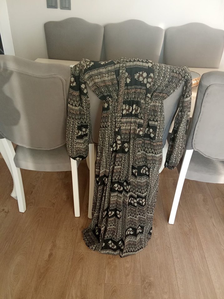 Bohem tarzda, gri desenli, uzun ve bol kesim elbise. V yaka ve uzun kollu, dökümlü tasarıma sahip.