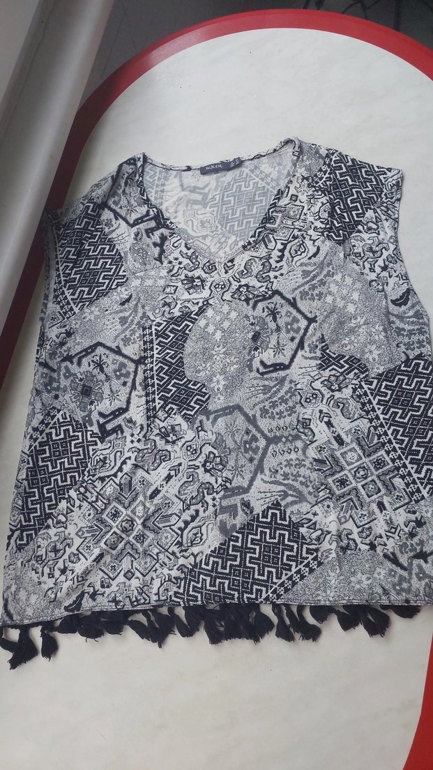 Gri desenli, zincir detaylı, V yaka ve kolsuz bohem tarzda, bol kesim uzun hamile tunik. Günlük kullanıma uygundur.