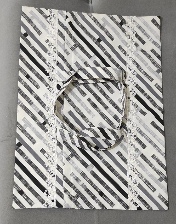 Gri renkte, çapraz çizgili desen ve yanlarda dantel detayları bulunan tepsi , borcam çantası sapları ile taşıma Kolaylığı sağlar su itici özelliği ile duck kumaştan fermuarlı borcam çantası
