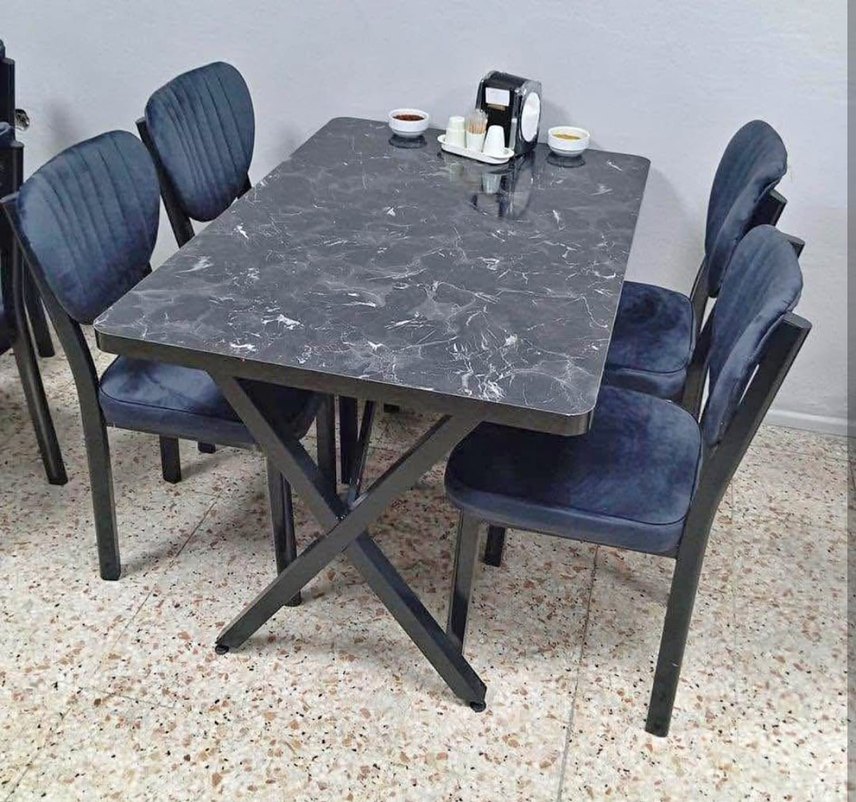 Gri desenli yüzeye sahip bu çağdaş yemek masası, sağlam siyah metal X şeklinde ayaklarıyla modern ve dayanıklı bir tasarım sunar. ️
