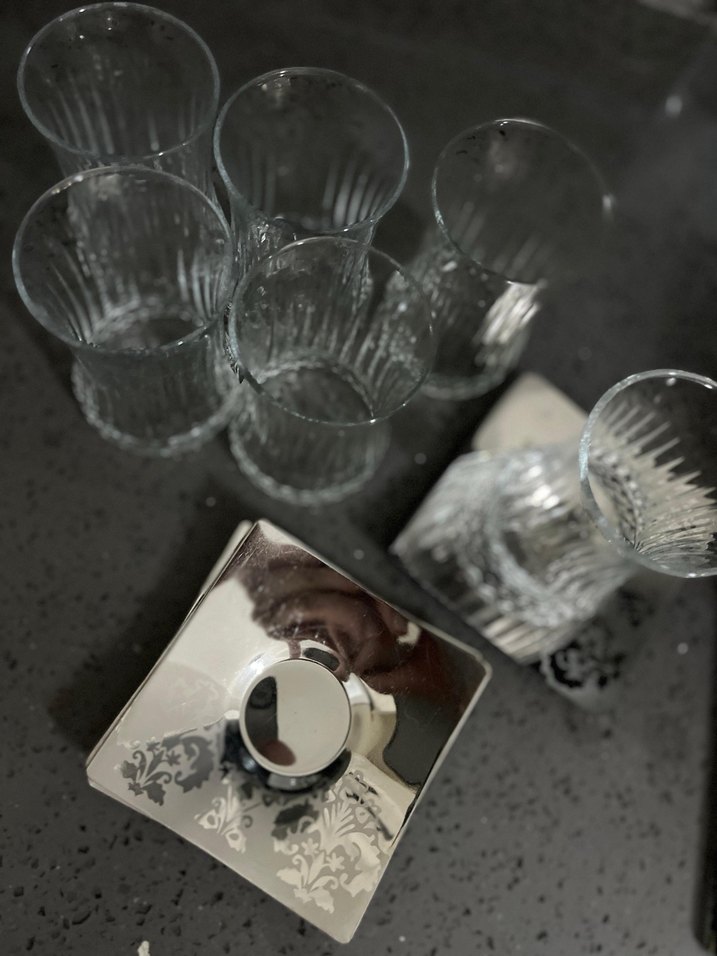 Dikey çizgili dokulu gri cam bardak seti ve çiçek desenli kare metal kapak. Günlük kullanım için şık ve sade tasarım.