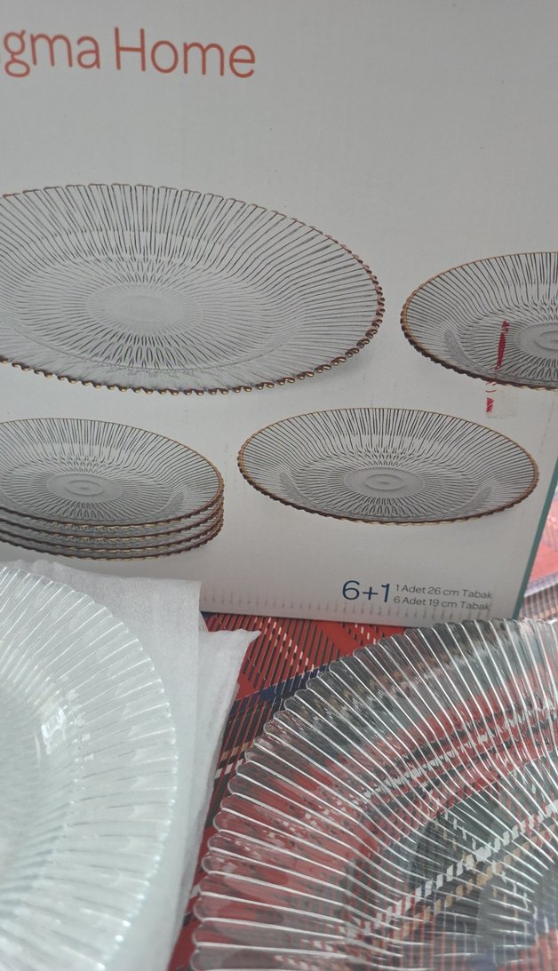 Gri renkte, çizgili desenli 6 küçük 19 cm ve 1 büyük 26 cm cam tabaktan oluşan çağdaş tasarımlı tabak seti. ️