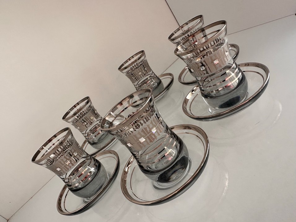 Gri renkli, geometrik desenli ve gümüş detaylı çay bardakları ile tabakları içeren takım. Çay servisi için uygundur. Çok ağır ve kaliteli üründür