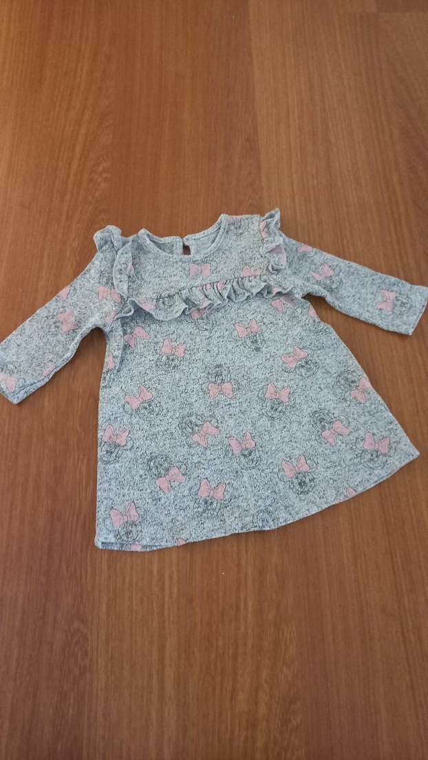 Gri sentetik kumaştan, pembe fiyonk desenli çocuk elbisesi yumuşak ve rahat bir dokunuş sunar. ️