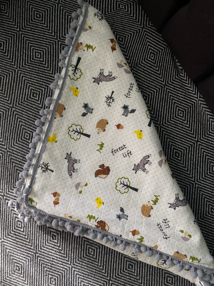 Yumuşak sentetik kumaştan yapılmış, orman hayvanları desenli gri çocuk pikesidir. Ponpon süslemelidir.