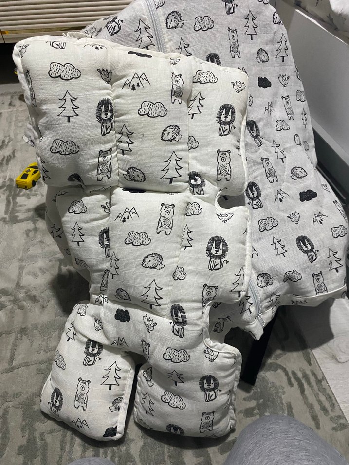 Yumuşak sentetik kumaştan yapılmış, gri renkli ve hayvanlarla doğa desenli çocuk uyku aksesuarı. Uyku sırasında ekstra konfor sağlar.
