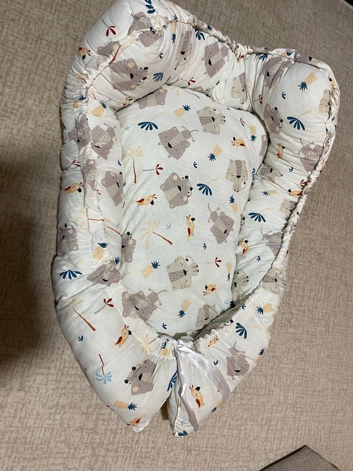 Gri renkte, hayvan desenli yumuşak sentetik kumaştan yapılmış çocuk uyku yatağı.