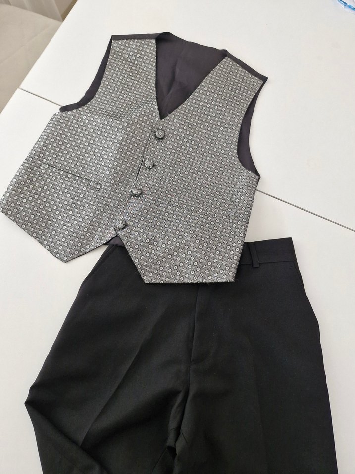 Düğmeli, kolsuz gri, siyah yelek, siyah pantolonla kombinlenmiş. düğün ve özel gun içindir pantolonun sağ dizinde çok az bir ütü parlaklığı var giyince belli olmuyor Pantolon boy 80cm bel 60 cm fakat lastik var daha geniş olabiliyor Yelek boy 45cm bel genişlik 38cm'dir