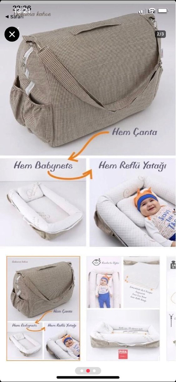 Gri renkli, desenli çok fonksiyonlu bebek çantasıdır. Hem taşıma hem de portatif bebek yatağı olarak kullanılabilir.