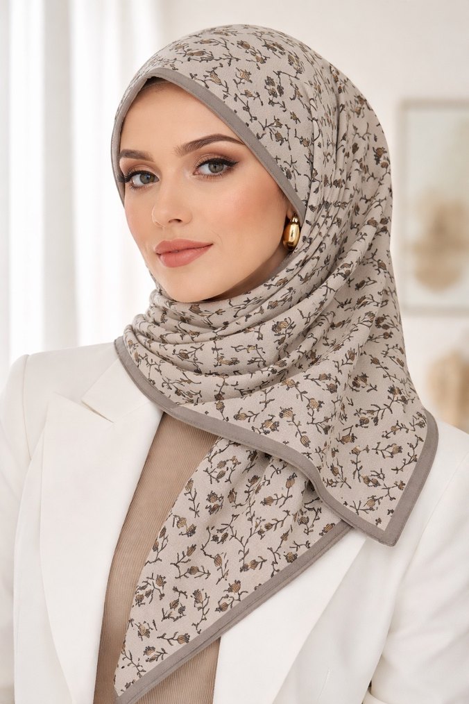 Gri renkte, gri desenli, yumuşak sentetik kumaştan drapeli kadın şalı, iş ortamına uygun modest tarzda.