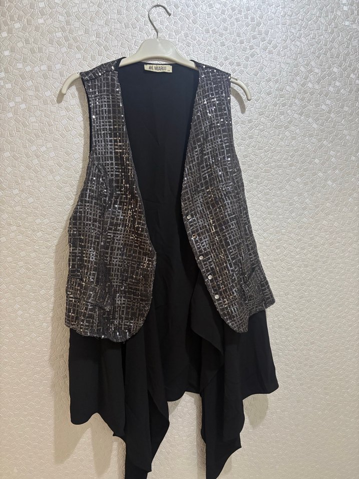 Gri desenli, kolsuz, drapeli kısa yelek. Notch yakalı ve bol kesimdir, şık ve avant-garde tarzda.