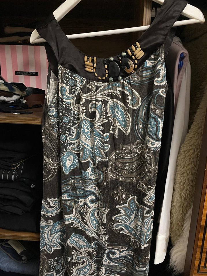 Gri desenli, uzun . Askısız yaka ve bol kesim. Bohem tarzda, kumaş desenli, bel kemerli. Kolsuz, günlük kullanım için uygun.