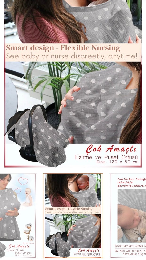 Gri desenli, esnek ve kısa kesim emzirme örtüsü, 120x80 cm boyutunda olup, rahatça bebeğinizi görerek emzirebilmenizi sağlar.